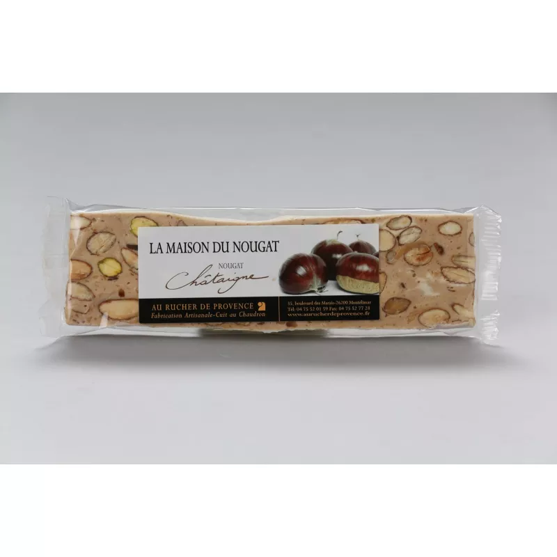 Une barre de nougat tendre au miel de lavande et aux amandes de Provence subtilement associés à des éclats de chataigne.